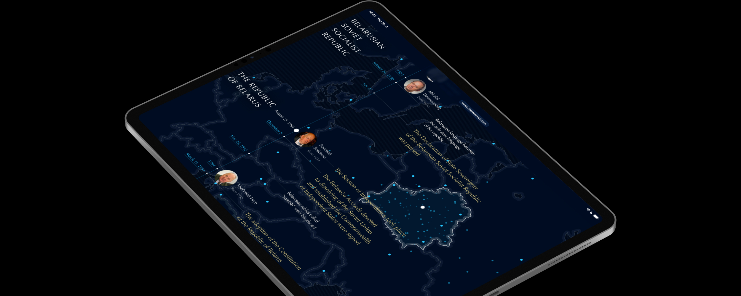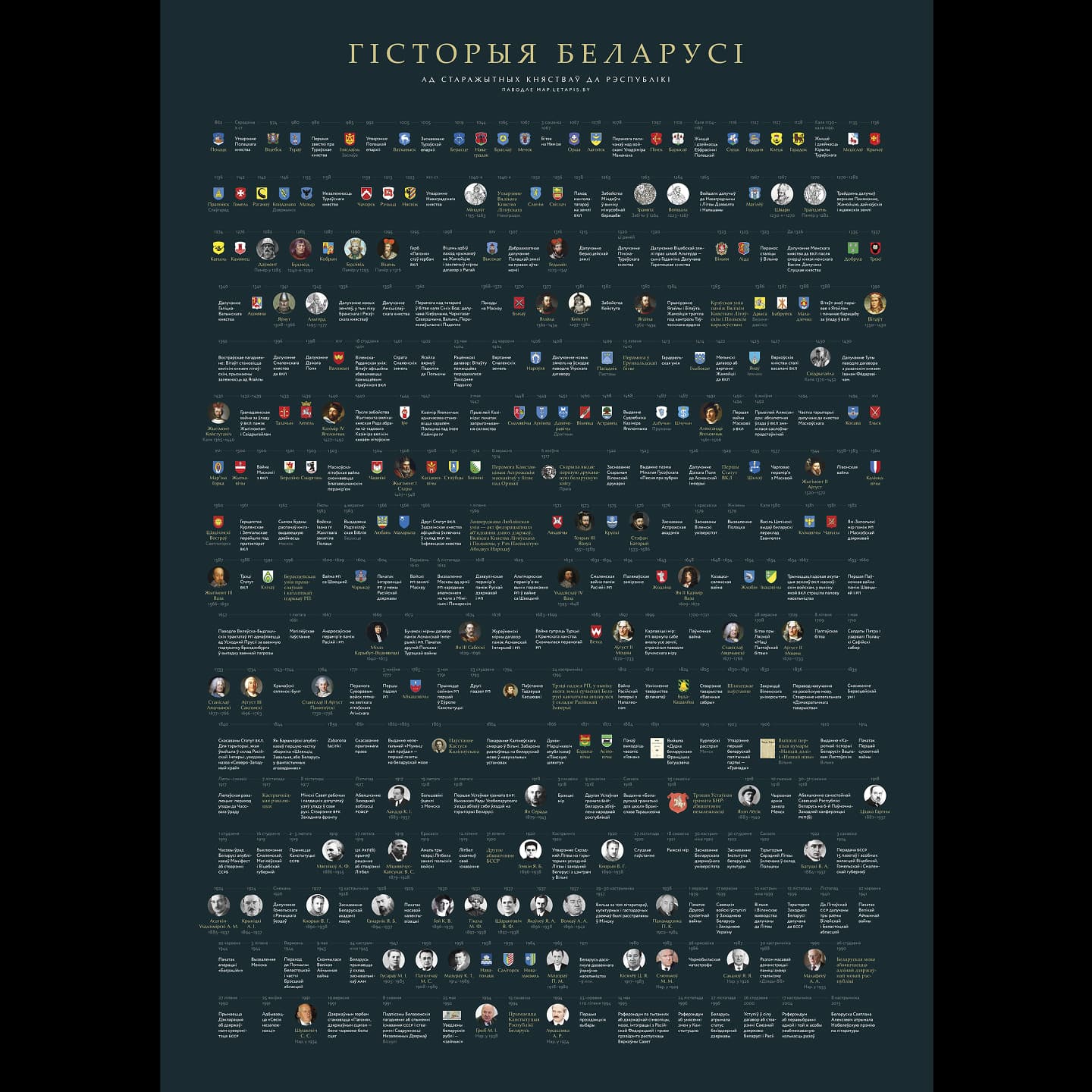 A poster timeline of Belarusian history featuring key events, rulers, cities, and notable figures. Designer, 2017