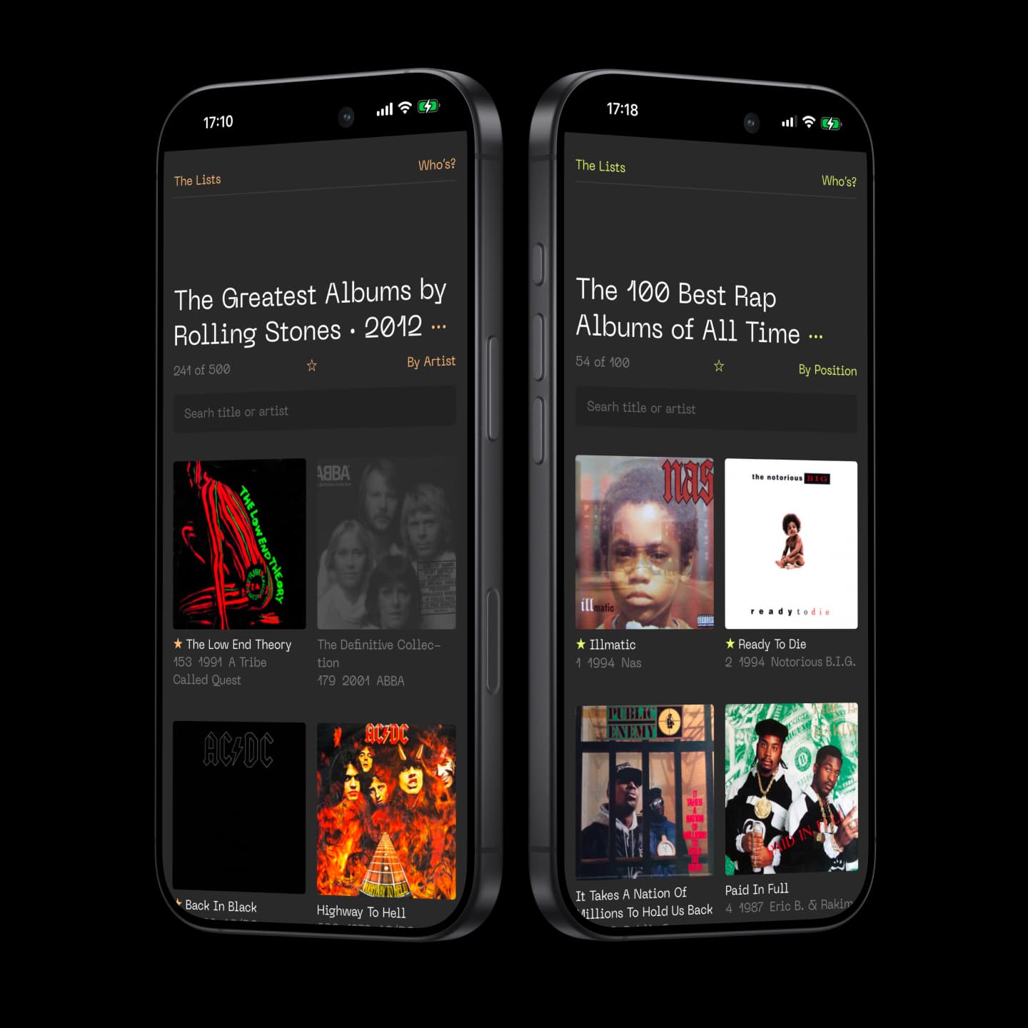 A small app for tracking albums in curated lists like “The Greatest Albums by Rolling Stone” and adding personal ratings. Art Director, Designer & Developer, 2021