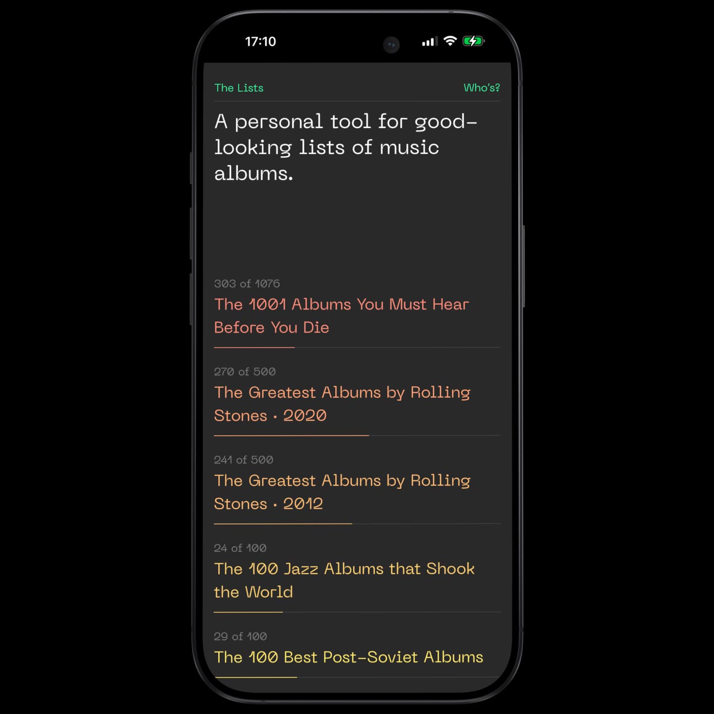 A small app for tracking albums in curated lists like “The Greatest Albums by Rolling Stone” and adding personal ratings. Art Director, Designer & Developer, 2021
